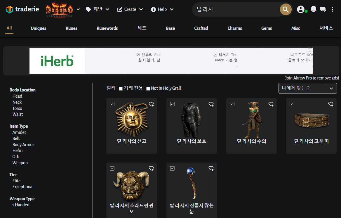 이런 식으로 상단 검색창에 검색을 하면 관련 템이 나오는데 클릭해서 들어가면 된다.