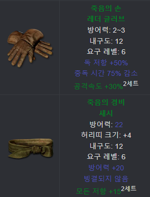 갑옷은 잠행이 있고 장갑과 벨트는 죽음 세트를 사용한다고 생각하면 결국 남는 부위는 투구와 신발이다. 방패는 안쓰는 캐릭터도 있고, 그렇게 효율이 좋지 않다.